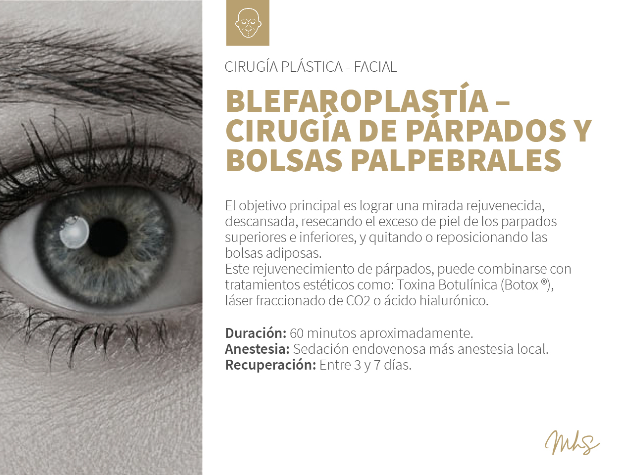 Rejuvenece la mirada descansada, resecando el exceso de piel de los parpados superiores e inferiores, y quita o reposiciona las bolsas adiposas.